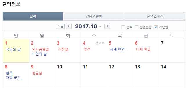 2025년과 2028년 추석은 개천절과 한글날 사이에 있기 때문에 추석 연휴가 10일이 됩니다. 사실 이와 똑같은 케이스가 2017년에 있었습니다. 먼저 어떠한 경우였는지 알아본 후 2025년과 2028년 추석에 대해 알아보도록 하겠습니다.